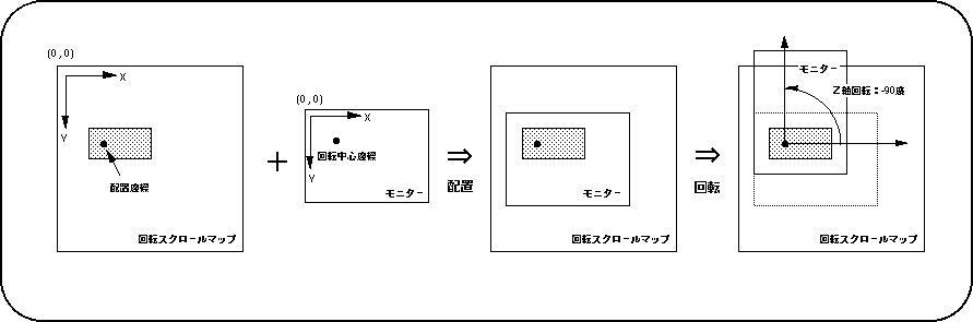 The function “slLookR” is used to determine the display position of the rotating scroll screen, and the function “slDispCenterR” is used to determine the rotation center coordinates.