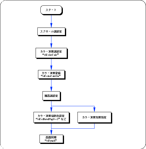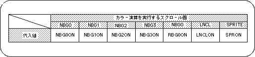 Scroll planes that have been set and registered for color calculation are actually executed by using the functions “slColRateNbg0-3”, “slColRateRbg0”, “slColRateLNCL”, and “slColRateBACK” that correspond to each scroll plane. (Specified as a ratio).