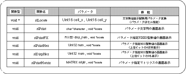 For the parameter, substitute the character string to be displayed (char type variable enclosed in "") and the display position (converted to void * type by "slLocate"). However, the character string is limited to single-byte alphanumeric characters.