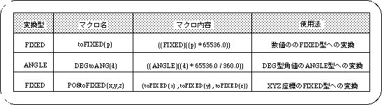 Actually, conversion from floating-point numbers to fixed-point numbers is supported in the form of macro definitions, so there is no need for individual conversion by individual individuals (see “Table 1-1: Macro examples for numeric type conversion”).