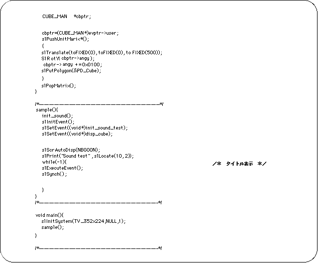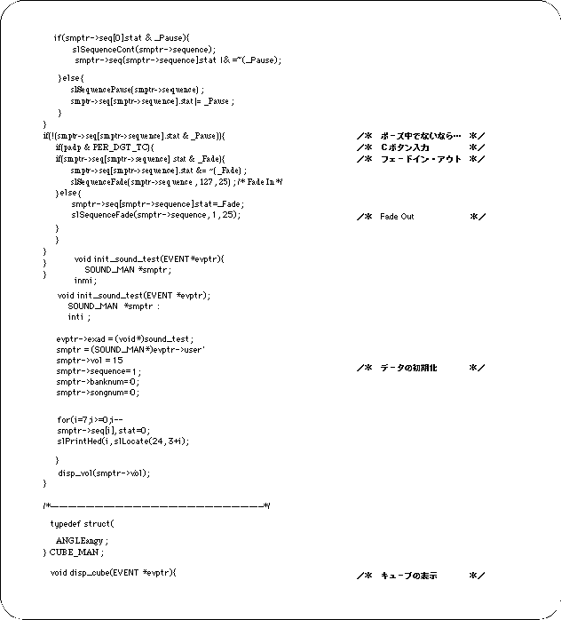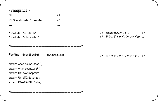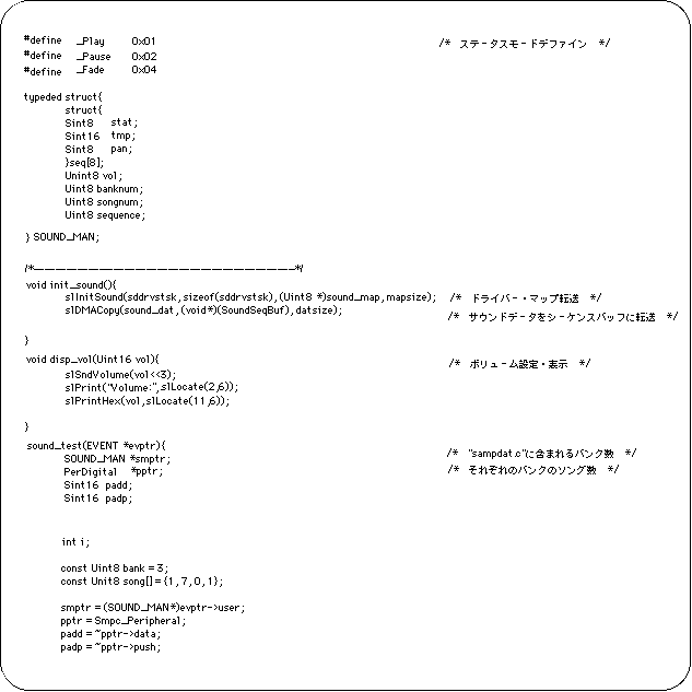The following sample program was created for BGM and sound effects playback tests. The data file used in this sample has the following structure.