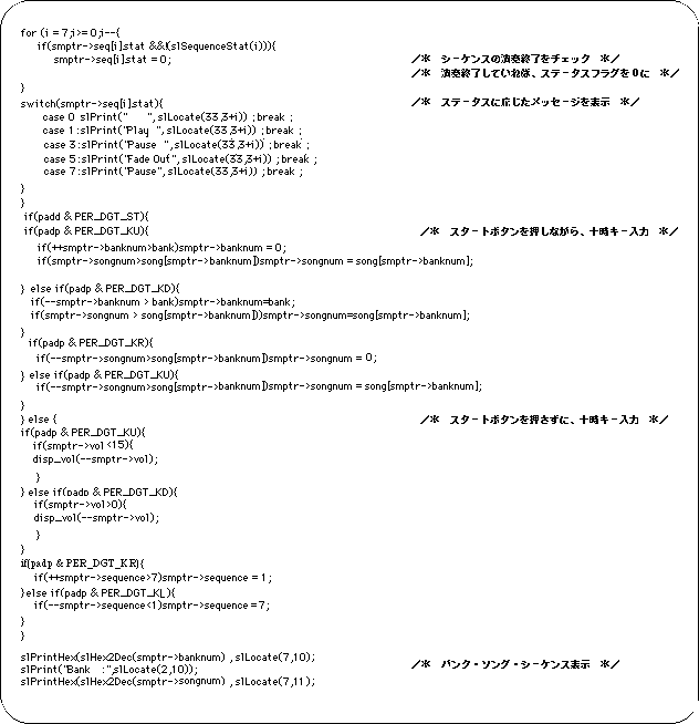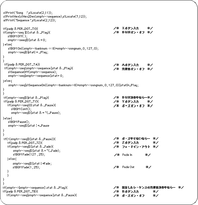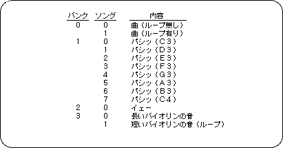 The song specified in the bank and song is played as BGM by pressing the X button and played as a sound effect by pressing the A button. Banks and songs can be specified using the Start key and the 10:00 key. The Y button and B button are paused on and off for BGM and sound effects, respectively, and the Z and C buttons are faded in and out. The sequence number of the sound effect can be specified on the left and right of the 10 o'clock key.