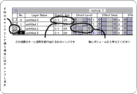 Next, use the created waveform to actually assign sounds to the keyboard. At the same time, the key touch strength and sound change are set.