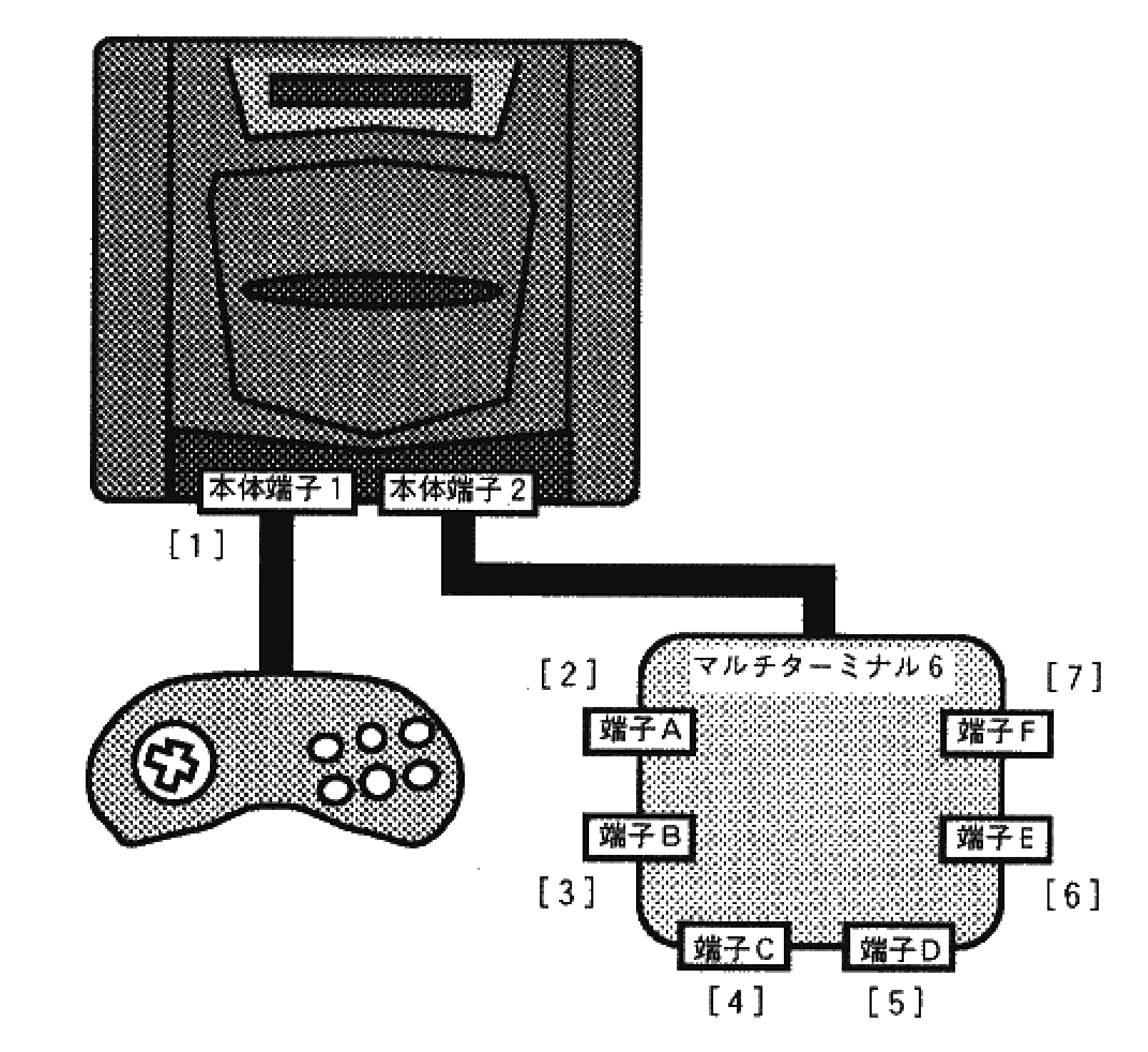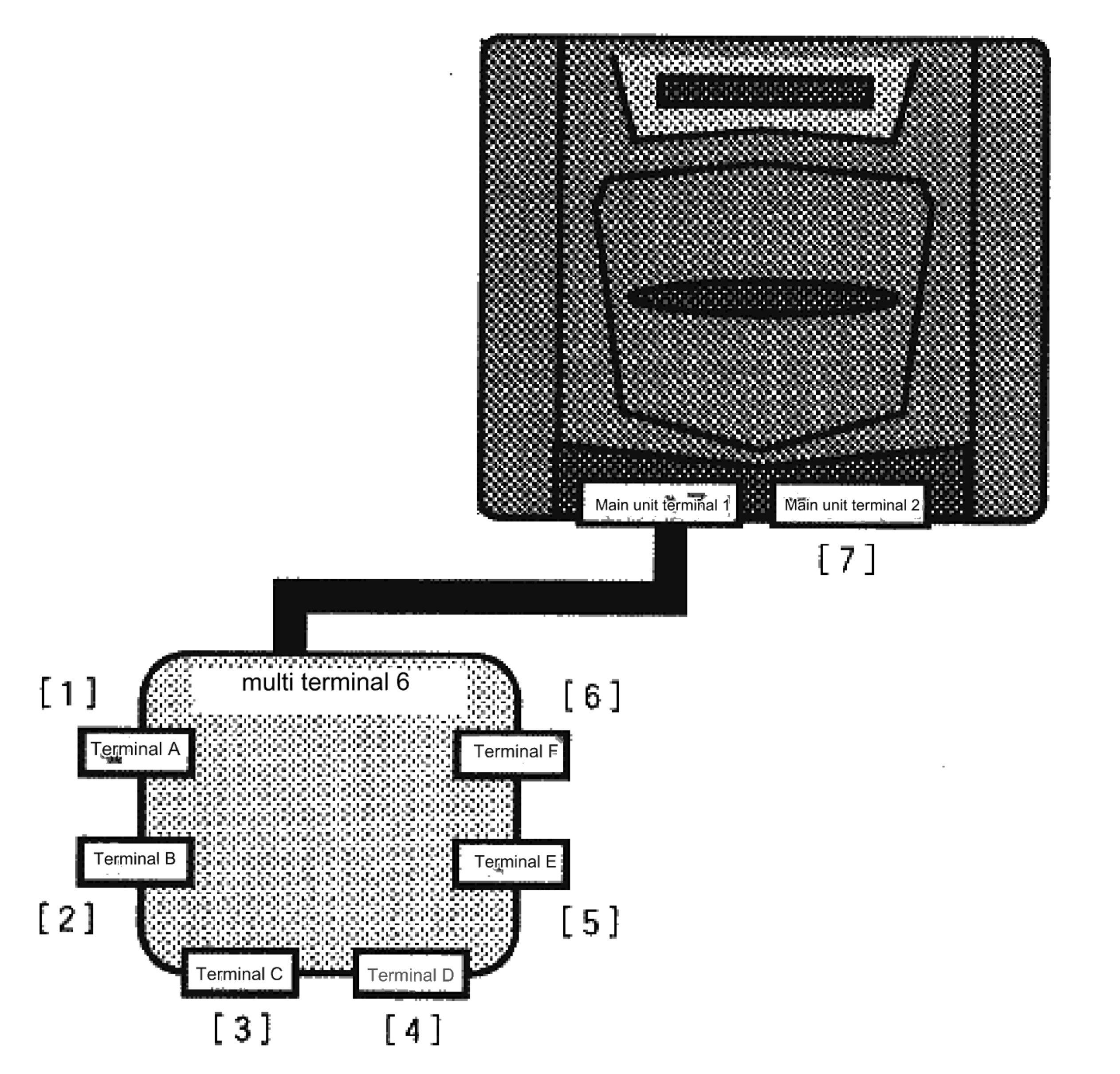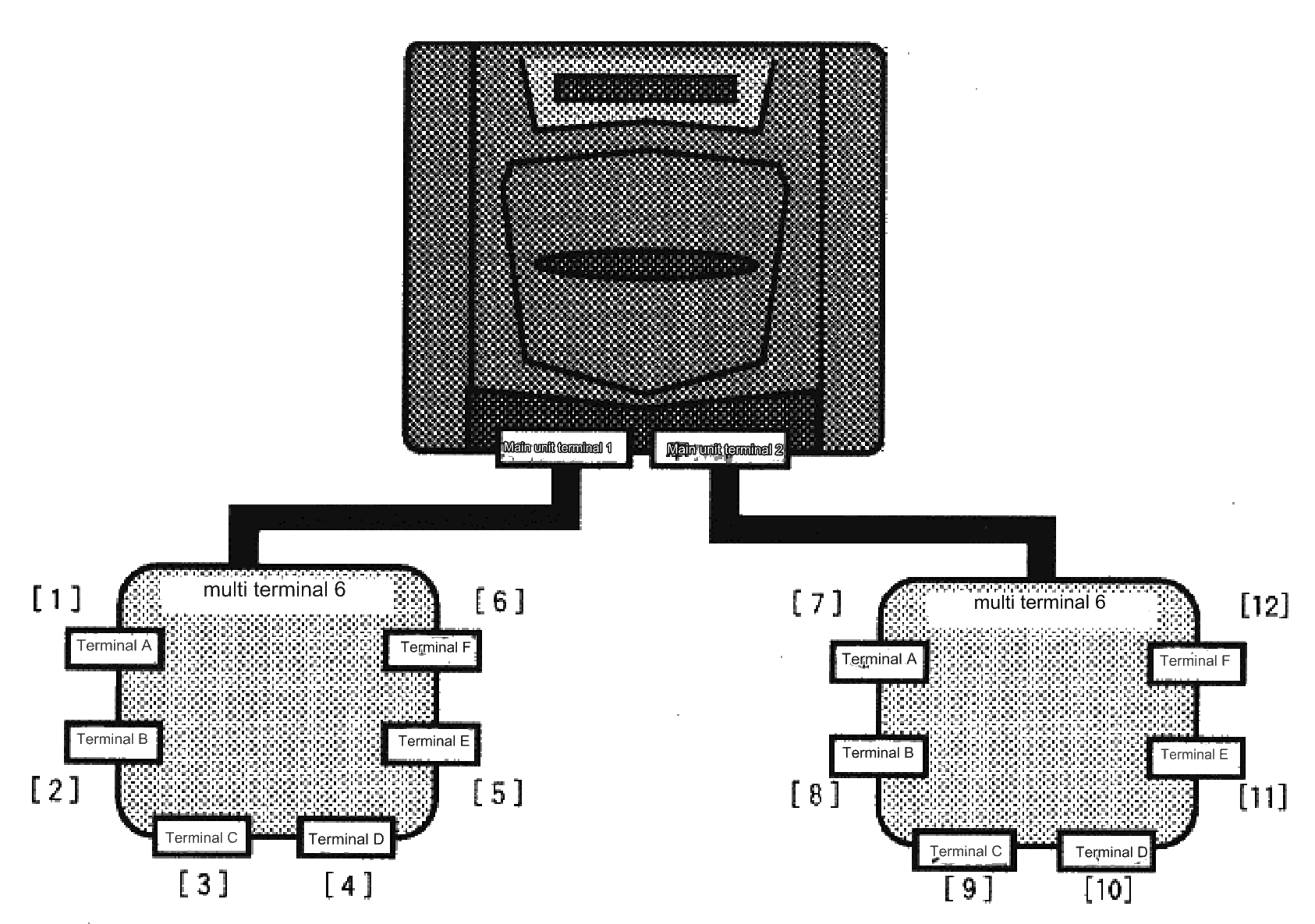 < Multi-terminal configuration principles> - Do not start the game if a compatible P or multi terminal is not connected to terminal 1 of the main unit. ・When a multi-terminal is connected to terminal 1 of the main unit, if the corresponding P is not connected to any terminal of the multi-terminal, the game must not be started. ・ When playing with multiple players, it must work properly regardless of whether the multi-terminal is connected to main unit terminal 1 or main unit terminal 2. (See connection example on next page) - When assigning operation numbers, depending on the connection status of the multi-terminal, priority should always be given to the terminal with the lowest number (the terminal on the left), and operation numbers must not be reversed. |